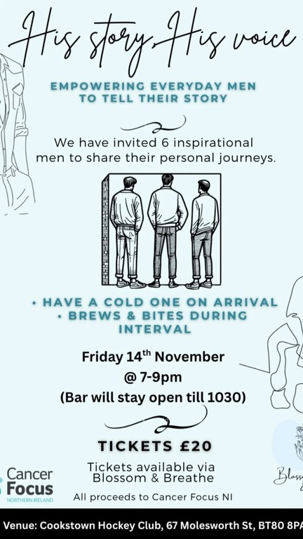 In the run up to International Men's day, Blossom&Breathe are hosting "His Story, His Voice". Inspirational men sharing their journeys of highs, lows and everything in between. All proceeds going to Cancer Focus NI. Tickets available on bookwhen or can pay at the door on the night.