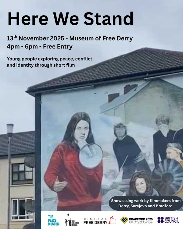 The Bloody Sunday Trust is delighted to host Here We Stand, an evening of powerful short films by young filmmakers from Derry, Sarajevo, and Bradford. These films explore conflict, peace, and identity, originally showcased at the Here We Stand exhibition during Bradford UK City of Culture 2025.