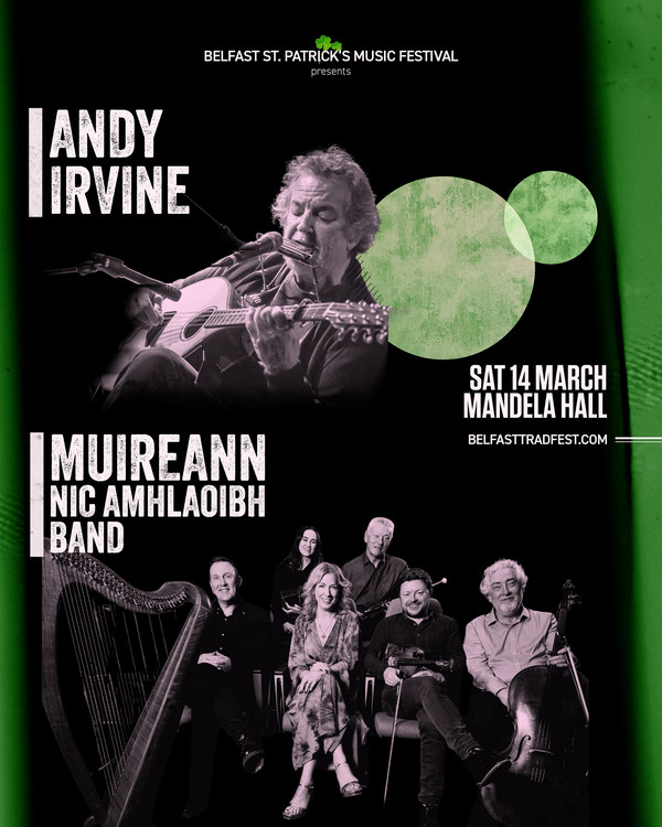 Belfast TradFest is delighted to present a stellar double bill on Saturday 14 March in the Mandela Hall, featuring the legendary Andy Irvine of Planxty, alongside RTÉ Radio 1 Folk Singer of the Year Muireann Nic Amhlaoibh and her exceptional new six-piece band.