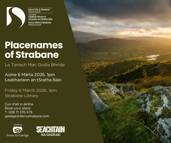Join placenames researcher Tarlach Mac Giolla Bhríde for a special lunchtime talk exploring the rich heritage of local placenames in Strabane. The talk will delve into the stories, meanings and heritage behind the placenames and townland names of Strabane, revealing how the Irish language is deeply woven into the landscape and history of the area.