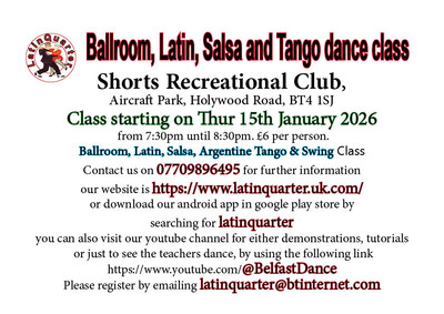 Jan 15 - Dec 10 2026 Daily Ballroom & Latin Dance Class Jan 15 - Dec 10 2026 Shorts Recreational Club, Belfast