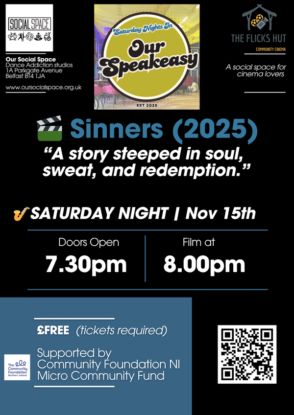 Expect a cosy pop-up cinema experience with friendly faces, free popcorn, and a touch of Speakeasy charm. Whether you’re a regular or brand new to Our Social Space, you’ll be warmly welcomed to enjoy a night of great cinema and good vibes.