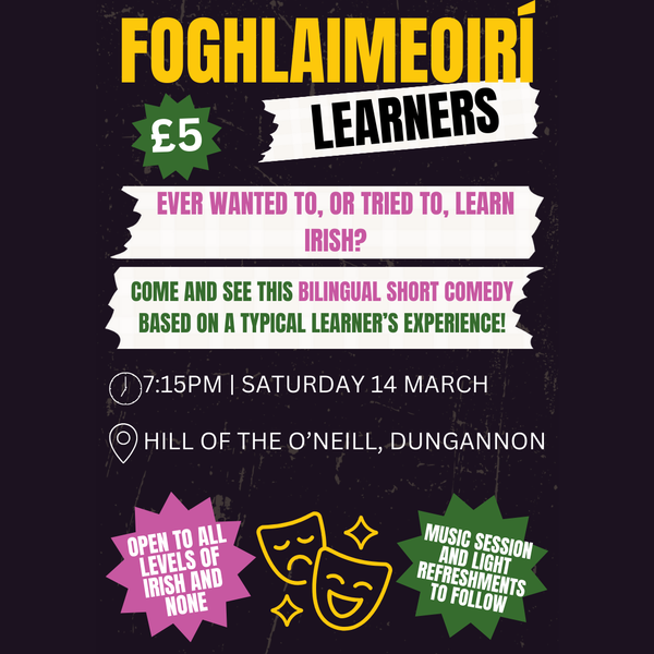 A short comedy based on the experiences of a variety of adult Irish language learners as they take their first steps on their language journey. The comedy is part of a social night for Irish language learners of all levels and none. A discussion on the learning of Irish hosted by Fearghal Mag Uiginn will follow the comedy. Audience participation in the discussion welcome. The night will conclude with music and light refreshments. This event is part of the Seachtain na Gaeilge 2026 Festival.