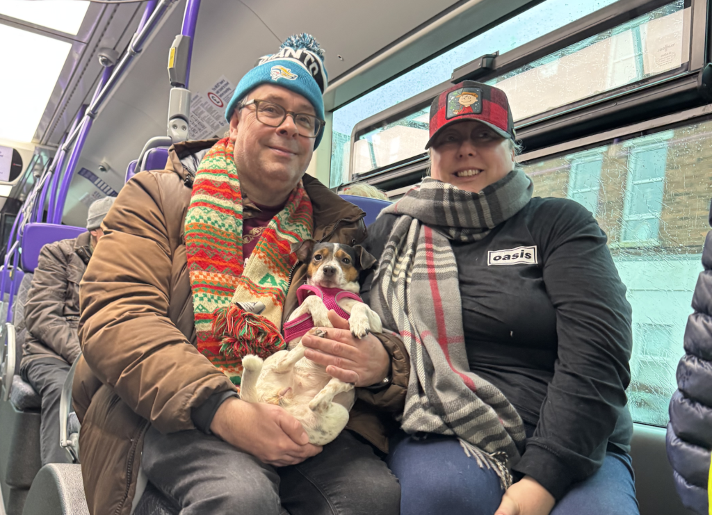 Photographs from the day capture Jim Deeds performing between seated passengers, volunteers coordinating the journey in high visibility jackets, and festival members gathering at stops along the route, reflecting the sense of connection and shared experience that defines the festival.