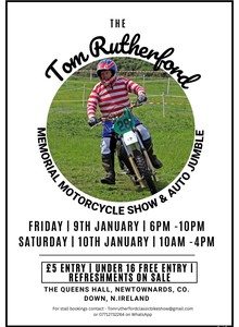 Jan 9 - Jan 10 2026 Daily Tom Rutherford Memorial Motorcycle Show & Auto Jumble Jan 9 - Jan 10 2026 Queens Hall, Down